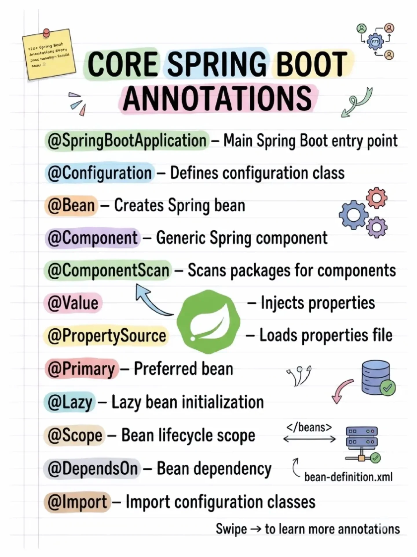This annotation indicates that a class provides Spring Boot-specific configurations. It acts as a specialized form of the @Configuration annotation, making it clear that the class is intended for Spring Boot applications.